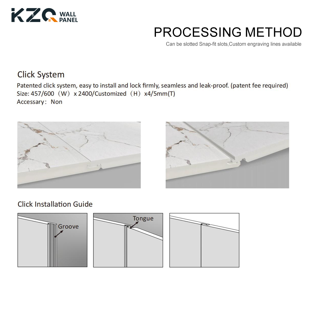Το πάνελ τοίχου SPC διατίθεται σε πάχος 4mm και 5mm, καθιστώντας το κατάλληλο για διαφορετικές ανάγκες εγκατάστασης. Το σύστημα εγκατάστασης Unilin Lock καθιστά την εγκατάσταση εύκολη, εξοικονομώντας χρόνο και κόπο. Ο σχεδιασμός click stone του πλακιδίου πάνελ τοίχου SPC είναι βολικός για εγκατάσταση DIY στον τοίχο, και μπορεί επίσης να χρησιμοποιηθεί ως δάπεδο.